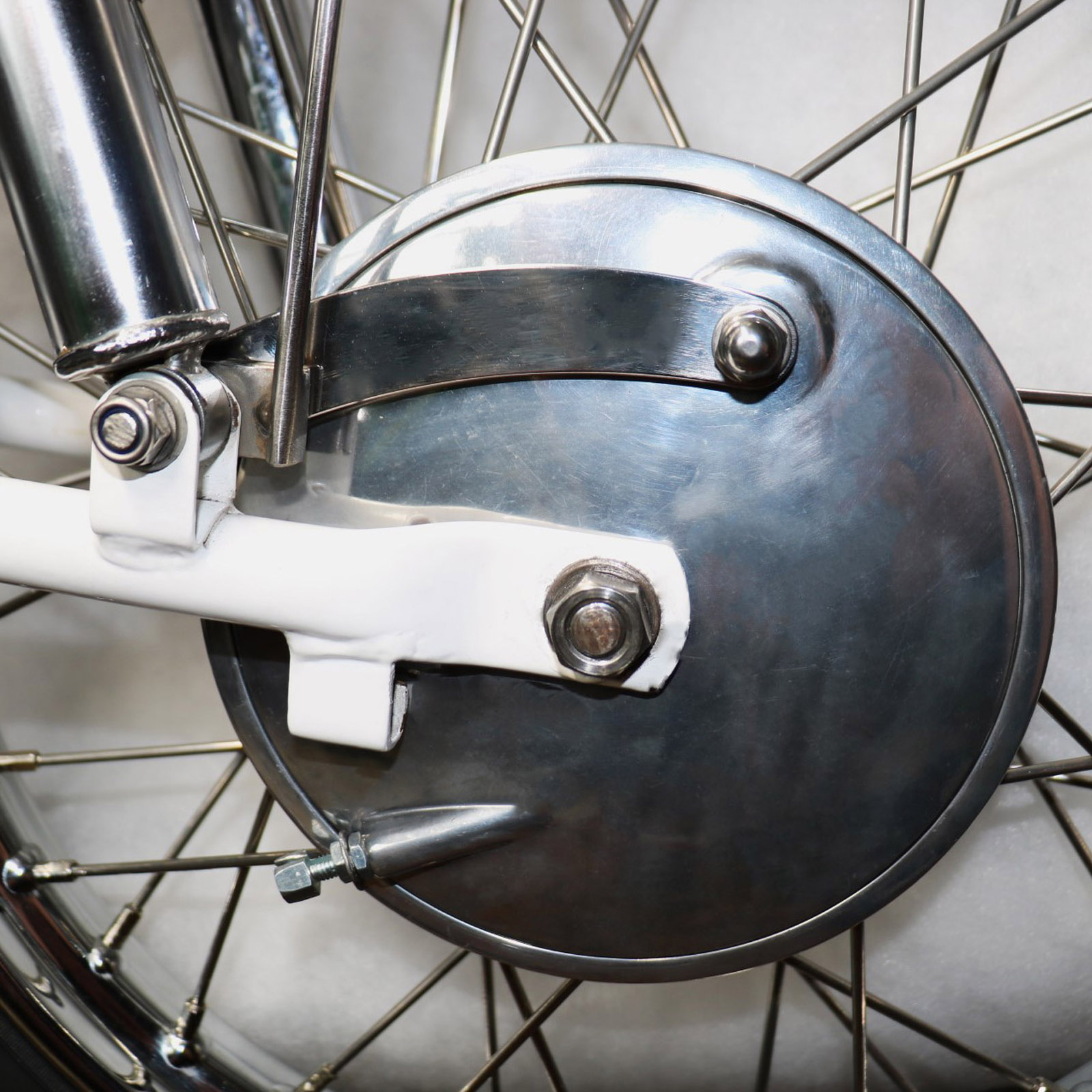 Dieser Gegenhalter oder auch Drehmomentstütze genannt, wird beim Umbau auf MZ Bremse bei der Vorderradbremse der Vogelserie verwendet. Im Gegensatz zu üblichen Gegehaltern ist dieser bewusst schlank gehalten und fügt sich somit harmonisch in das Gesamtbild ein. Befestigt wird er auf der Inneseite des rechten Stoßdämpferhalters. Er ist aus VA2 Edelstahl mit einer Stärke von 4mm gefertigt und hochglanzpoliert.
