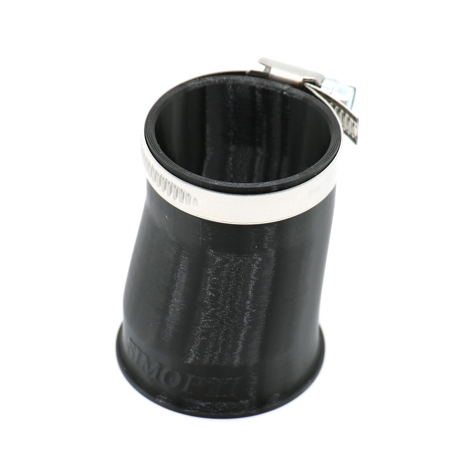 Lange Muffe für Mikuni-Vergaser, wenn das Zwischenstück nicht verbaut ist. Auch als VM16 erhältlich. Die VM16  Muffe ist passend und muss nicht gekürtzt werden. Die Muffe für VM20 ist vergaserseitig länger gedruckt als notwendig, damit die Länge entsprechend des Verwendeten Adapters angepasst werden kann. Länge messen, durch Klebeband markieren und an der Klebebandkante entlang mit einem Cuttermesser abschneiden. Für einen besseren Halt auf dem Vergaserflansch, ist zusätzlich eine Schlauchschelle im Lieferumfang enthalten.